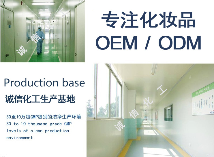 广州市诚信化工有限公司是一家集研发、生产及销售为一体的专业化妆品OEM/ODM加工企业。公司厂区环境优美,厂房面积超过20000平方米,目前拥有多条现代化的生产线,多台/套国际、国内先进乳化、自动灌装、试验、杀菌、检测等仪器,具备各类膏霜、洗护、美容化妆产品的生产条件和能力,年生产能力可达到百万支,同时工厂不仅能生产各种形态、规格、品种的化妆品,还能实现化妆品所有常规检验项目的检测。 生产车间环境完全按照GMP认证所需要的条件建设,并一次性通过“IS09001”质量认证,其中实验室、原料室、灌装间、内包材消毒存放间和更衣室均采用十万级空气净化标准,其他区域采用三十万级空气净化标准,全方位保证企业的产品在消费者手中的安全使用,让消费者放心消费。 工厂自投产以来,严格按国家各项政策、法规实施经营管理,求实创新,积极进取。严格执行质量体系的同时按GMP要求组织日常全过程生产,使每一支验收合格的产品,在市场上让不同地区的消费者满意,从而让企业赢得更多消费者的青睐,产品远销欧美、东南亚、非洲、中东等地。 诚信化工技术优势: 我司拥有一支国际顶尖级技术的研发团队(教授级专家顾问、博士后和研究生、美国AIKE生物研究中心、港大精细化工与中药联合实验室、中大美容医学应用中心)汇集了多国医学、皮肤学、生物科技等领域的研发机构,同时和国内多家知名大学有着长期的紧密合作关系;凝集众多国际驰名化妆品品牌研发配方的专家,确保化妆品开发研究领域处于全球领先水平,保证了我司产品在品质上有强有力的竞争实力。 以下专利技术已经成功运用到产品生产中: (1) 智能立体离子锁水补水技术 (2) 纳米陶瓷包裹技术 (3) 成分基因置换技术 (4) AA2G美白缓释技术 (5) 仿生色彩技术 (6) 生化科技疏导技术 (7) 微脂囊包裹技术 (8) 生化科技高助渗技术服务项目 (1)为客户提供包装、包材及技术咨询; (2)根据客户需求量身定制个性化配方产品; (3)半成品及成品加工; (4)代办客户产品包装设计,代购产品包装; (5)代办产品商标注册及出口报关、质量检验; (6)根据客户的具体情况,为客户品牌进行全方位一体化的形象设计、营销策略、广告策略、市场推广策略及长期发展规划; 服务对象 (1)专业美容院线客户; (2)日化线销售客户; (3)商场、专柜销售客户; (4)美容美发用品连锁销售客户; (5)日化自用产品如护理店、宾馆、桑拿中心、工矿企业客户;
